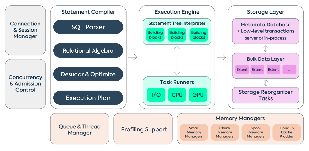 The SQreamDB execution engine employs thread workers and message passing for its foundation. This threading approach enables the concurrent execution of diverse operations, seamlessly integrating IO and GPU tasks with CPU operations while boosting the performance of CPU-intensive tasks.
